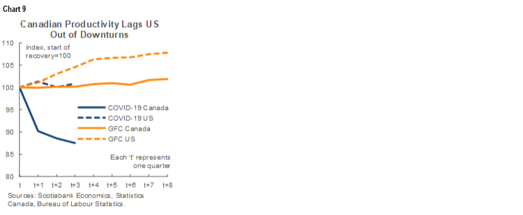 In fact, by the time the July meeting rolls around it remains feasible that another bond purchase taper will be in the cards before getting out of the bond buying game by Fall. The BoC’s clear pandemic-era emphasis upon not pulling back on the reins until we have a 110% inclusive recovery because we won’t get durable inflation until that point is being tested by persistent upsides to inflation tracking compared to what they thought would happen when all this stimulus was first put into place. Inclusiveness is wonderful, but in monetary policy terms it’s a concern that productivity growth is as bad as it has been in Canada relative to the US (chart 9) during what St. Louis Fed President Bullard has called keep households whole policies. This serves as a restraint against the supply side that could be the determining factor to generating sustained above-target inflation.