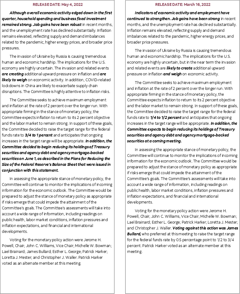 - The war’s effects on inflation shifted to the present tense through “are creating additional pressures” rather than “likely to create.”
