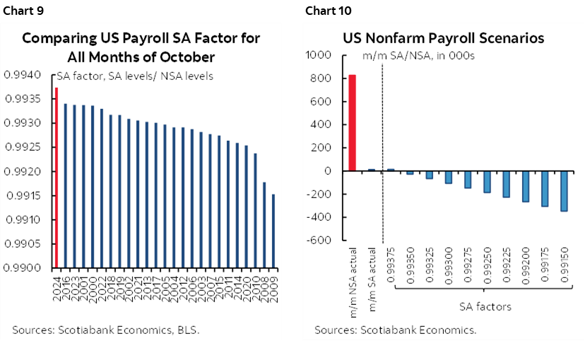 3. The seasonal adjustment factors remain just plain wonky. Chart 9 shows that October 2024 was the highest SA factor on record compared to like months of October in history. What that means is that payrolls, if anything, were overstated on first pass compared to a scenario in which the SAs were not subject to a recency bias in their estimation. Chart 10 shows by how much they would have fallen by looking at what would have happened to seasonally adjusted payrolls in October at varying SA factors applied to the same seasonally unadjusted estimate. Payrolls would have been significantly negative at any other SA factor in past month of October.