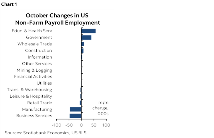Chart 1 shows the breakdown of the change in payrolls by sector. Goods sector employment fell by 37k and services employment was flat at +9k. Government added 40k. There was high breadth to the softness in payrolls with only education/health/social services and government posting material gains.