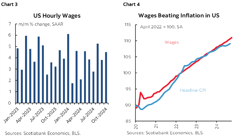 Wage growth was strong at 0.4% m/m SA. The 3-month moving average is about 0.4% after a trio of solid gains that have been pushing the year-over-year rate up from a low of 3.6% in July to 4% now. Chart 3 shows the pressures at the margin in that m/m SAAR wage growth picked up to 4.5%. As chart 4 shows, the real wage compression narrative remains incorrect; average US hourly wages adjusted for inflation have not been durably falling over the pandemic era and have in fact risen on a cumulative net basis to date.
