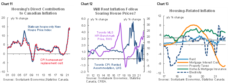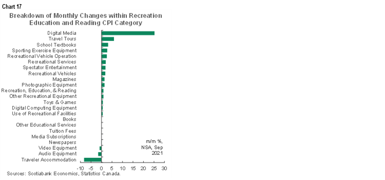 Charts 11–17 on the next few pages home in on trends in several specific categories. Homeowners’ replacement cost is a big upside driver (chart 11). Rented accommodation is continuing to heat up (chart 12). Chart 13 shows other housing-related components. Property taxes jumped in month-over-month terms during October as per the norm, but relatively stable in year-over-year terms. Mortgage interest remains a transitory downside that continues to see lower mortgage rates pass through in lagging fashion which is probably something that will turn the other way in 2022. Electricity price inflation was roughly stable.