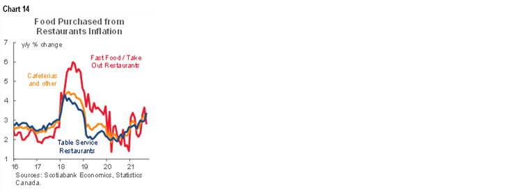Restaurant price inflation (chart 14) accelerated at full sit-down restaurants but saw an offset in volatile take-out prices.