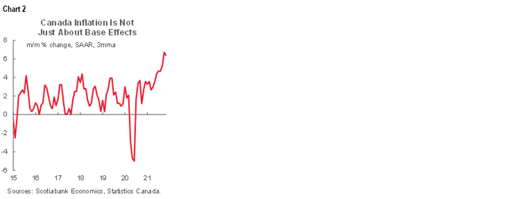Inflation continues to be about far more than just year-ago base effects (chart 2). Month-ago annualized and seasonally adjusted prices have been up by between 6–7% over the past four months and have been running hot since April.