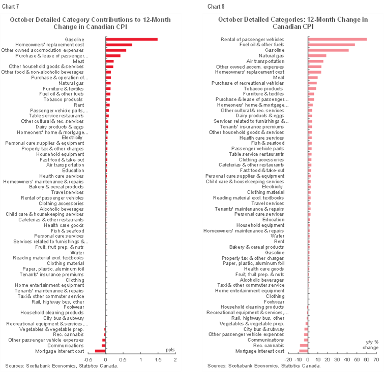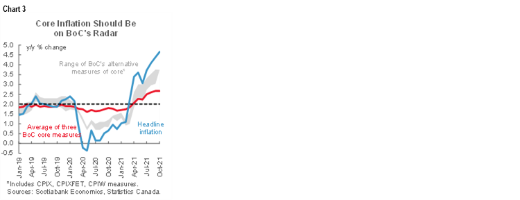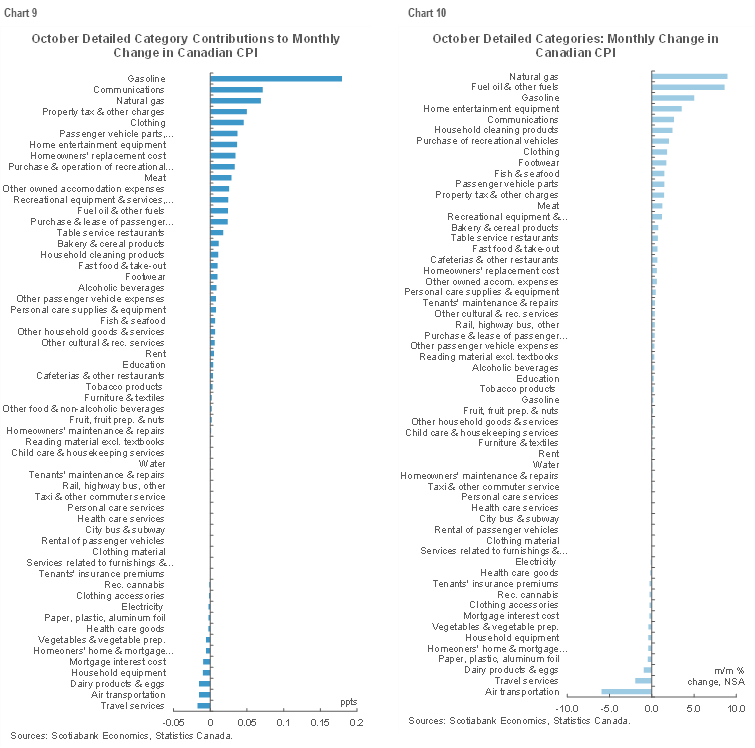 But first, in terms of highlights, average core inflation was unchanged at 2.67% y/y in October using the BoC’s three preferred gauges of trimmed mean CPI, weighted median CPI and common component CPI (chart 1).