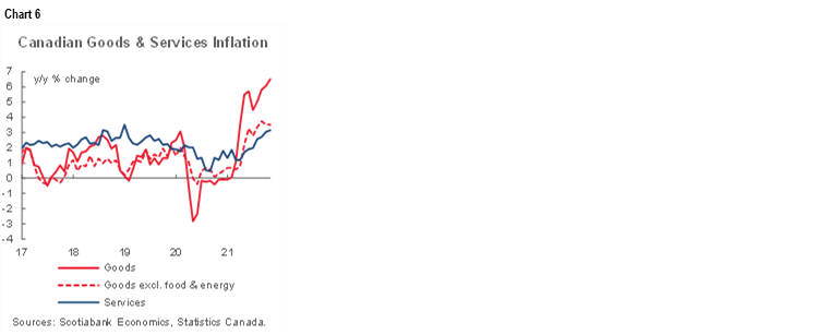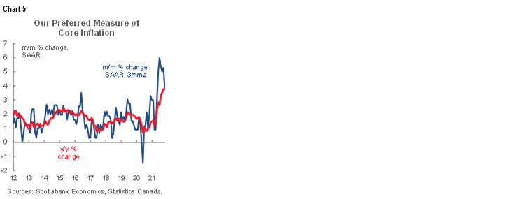 This is not a small issue. If Rene and Nikita are right, then the measure they are pointing to shows core inflation running at 3.8% y/y (chart 5). The rate of change in this core measure on a month-over-month seasonally adjusted and annualized basis is ebbing, but still running hot. That blows common component CPI’s reading of 1.8% y/y right out of the water. That, in turn, suggests that the BoC is perhaps not paying enough attention to the best gauge of underlying core inflation and has confused markets on the topic with too many measures of core inflation. Perhaps that’s by design amid uncertainty…. Nevertheless, if the BoC is internally emphasizing common component CPI to justify its transitory-for-longer than previously expected stance then it may be making policy vulnerable to emphasizing the wrong measure.