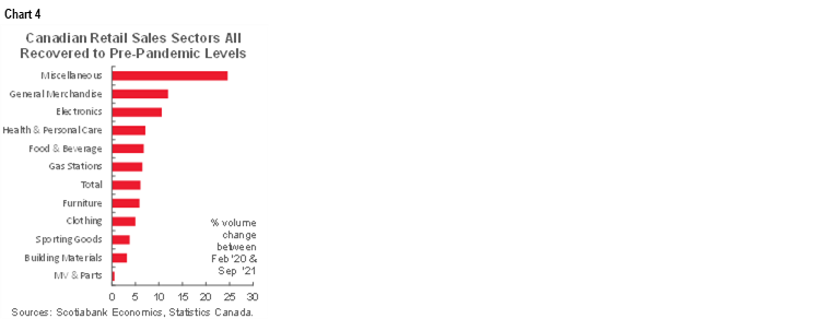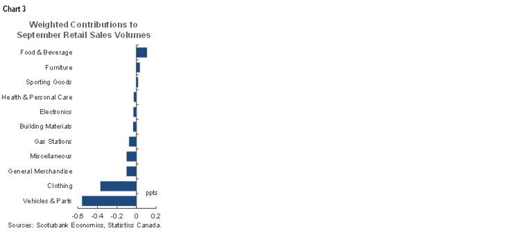 Chart 3 shows the breakdown of weighted contributions to September’s gain in the volume of sales by sector. There was high breadth to that month’s weakness. The ‘flash’ estimate for October from Statistics Canada does not offer any details, but given we know that auto sales were up last month that’s likely to be among the upsides when we get the fuller details in a month’s time.