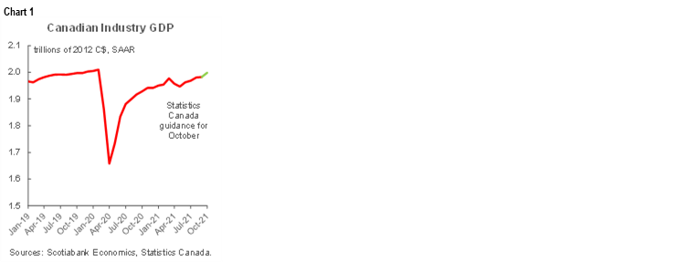Overall positive revisions to Canadian GDP saved the Bank of Canada’s forecast bacon—and everyone else’s for that matter. That’s important to note in terms of what it says by way of slack estimates in the economy compared to what the BoC was likely tracking before this morning. Canada is inches from a full recovery in GDP now with October only about ½% behind pre-pandemic GDP levels (chart 1).