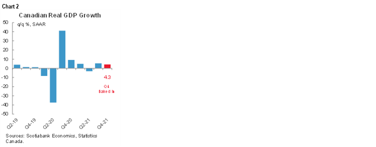 Q4 GDP growth is now tracking 4.3% q/q at a seasonally adjusted and annualized rate (chart 2). This is based upon monthly GDP figures using Q3 and October while assuming November and December come in flat in order to focus upon the effects of what we know so far. Flooding in British Columbia is likely to knock this back at least somewhat.