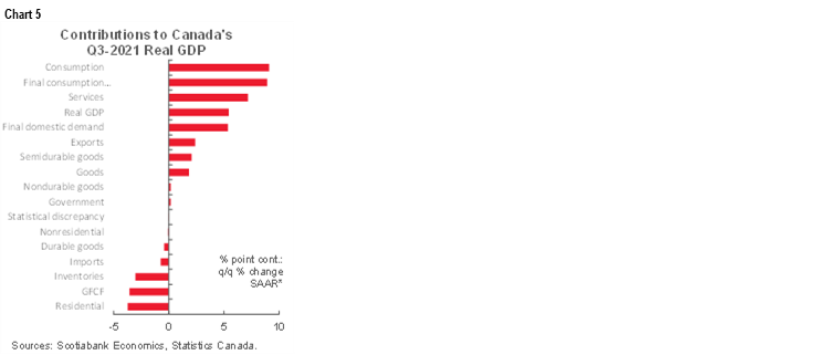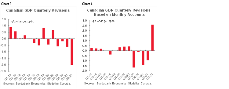 So where we find ourselves on revisions is summed up in charts 3 and 4. Chart 3 shows revisions to quarterly GDP growth up to 2021Q2 using expenditure-based GDP which is what the BoC forecasts. On net, those revisions took GDP levels down 0.2 ppts. That chart stops before Q3 because obviously we don’t have revisions to that measure of Q3 GDP yet after having only gotten the first estimate today. Chart 4 shows revisions to quarterly GDP based upon the monthly income/industry based figures which allows us to extend revision tracking through Q3 in order to show the positive upward revision to the monthly accounts behind the first estimate for Q3 growth using expenditure accounts that we got this morning. This helps to inform how the negative revisions up to Q2 were more than offset by upward revisions thereafter.