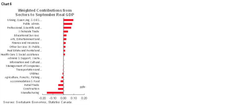 Chart 6 shows the weighted contributions to September GDP by sector. We don’t get details behind the ‘flash’ October estimate until the next report.