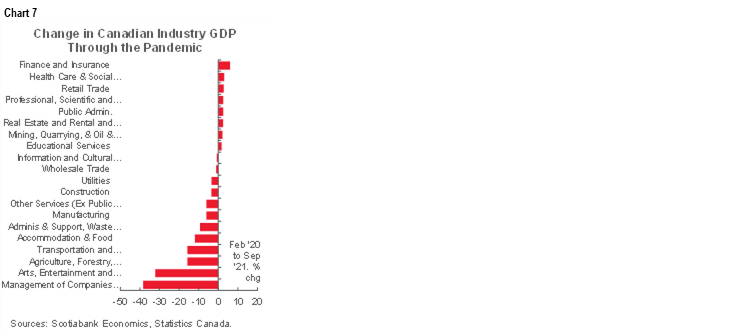 Chart 7 shows the still uneven nature of the recovery to date by sector.