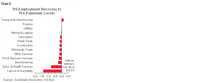 On net to date, the US is 4.2 million jobs shy of the February 2020 level. My opinion remains unchanged in that job markets are tighter than Fed Chair Powell thinks. Chart 2 shows that almost all of the still lost jobs remain concentrated in two sectors: leisure and hospitality plus education and health services.