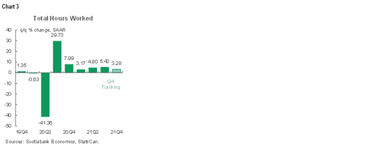 US hours worked were up by 0.2% m/m in October. They are tracking a 3.3% q/q SAAR gain in Q4 based upon the Q3 average and October while assuming flat readings in November and December just to focus upon the effects of what we know so far. Hours were up by 5.4% q/q SAAR in Q3. See chart 3. Since GDP is an identity defined as hours worked times labour productivity this points to strong momentum in the US economy.