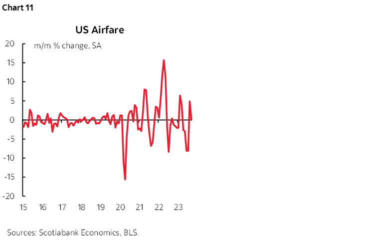 Housing accelerated pretty sharply. Housing's 44.5% weight saw it jump by 0.6% m/m SA, double the prior month. Shelter costs were up by 0.6%, also double the prior month. Owners’ equivalent rent climbed by 0.6% m/m from 0.4% prior (chart 5) while rent of primary residence has rebounded over the past couple of months (chart 6).