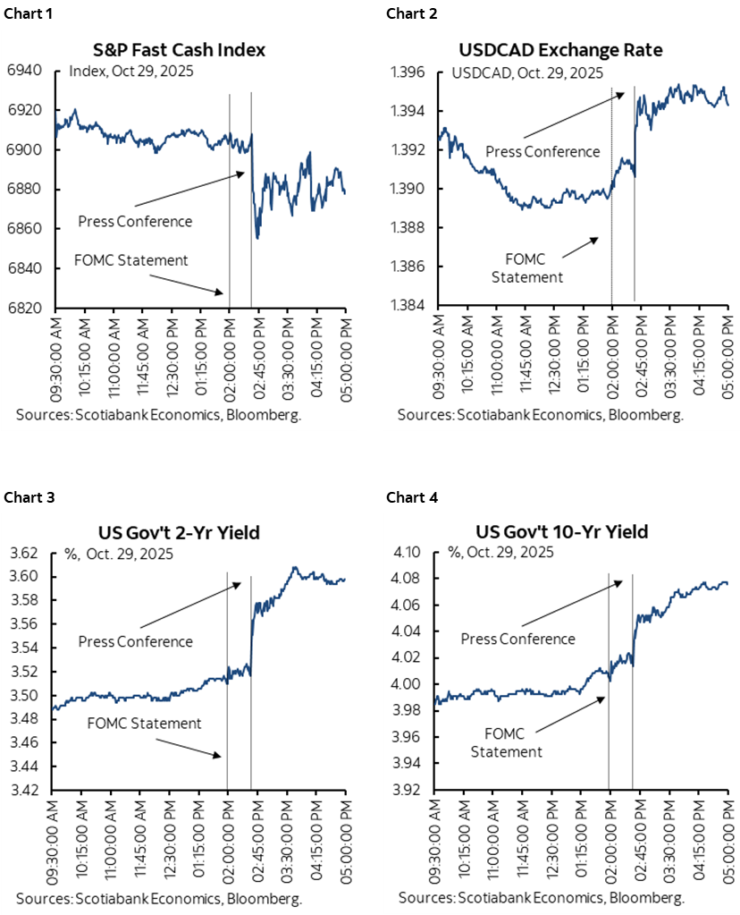 The FOMC cut its fed funds target rate range by 25bps as widely expected. The new range is 3.75–4%. The end of the policy of Quantitative Tightening was announced and is to be implemented on December 1st. So far so good in terms of expectations.