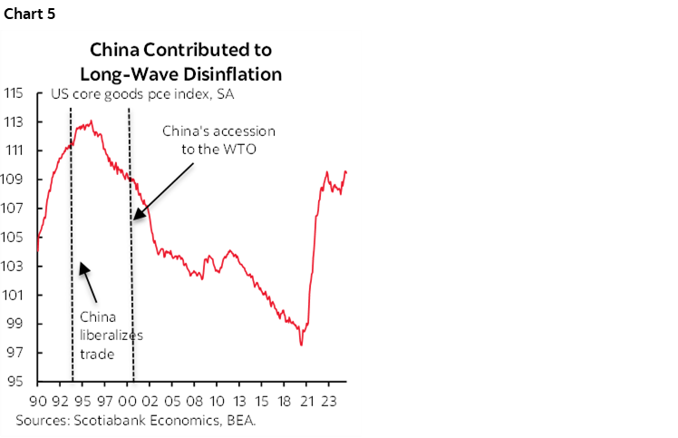 As an opposite example to today’s circumstances, if Powell were commenting on the disinflationary impact of China's shift to manufactured exports in the 1990s and accession to the WTO in 2001, he would have said there would only be transitory effects in a few inflation reports and nothing further had he applied the same logic he’s using today. Tariff cuts only impact things temporarily, he may have argued. And he would have missed the long wave of disinflationary pressures such as shown in chart 5. It’s very myopic and narrow to focus on just tariffs, rather than a wholesale rewriting of border frictions with multiple drivers that can take many years to work their way through. It’s possible that just-in-time inventory management is dead, legacy assets in higher risk markets will be abandoned, supply chains need to be recreated elsewhere, and often in higher cost western markets. Further, tariff changes can have wide ranging effects on important considerations like investment, productivity, and cost controls and hence carry influences beyond their mere short-term direct effects.
