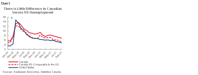 Fourth, the unemployment rate is now at 6.9% which remains higher than the 5.7% pre-pandemic level. Bear in mind, however, that the pre-pandemic unemployment rate was hovering around a record low and so targeting that while sitting at a zero policy rate and still buying bonds smells fishy to me. When measured using the same methodology employed in the US, Canada’s unemployment rate pretty much matches the US and yet Canada has a higher natural rate of unemployment than the US (chart 3). Check.