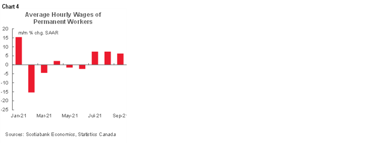 This is not the BoC's preferred measure of wage growth (though it used to be…) which is the quarterly wage common measure, but wage common lags like the skinny kid at the back of the ice cream line-up. At rapid turning points we should probably be emphasizing the freshest available readings as a starting point to the debate. The wage common composite only goes up to Q2 since it is mostly derived from quarterly accounts up to Q2 and combined with Q2 readings for wage growth from the lagging payrolls survey and LFS. I would think we would want a measure of wage growth that is not skewed toward when much of the economy was shut given lockdowns in Q2 when the economy contracted. If you want a fresh measure of wage growth at the margin, then it's the measure of average hourly earnings for permanent workers right up to September that we got in today’s report and that measure is screaming higher.