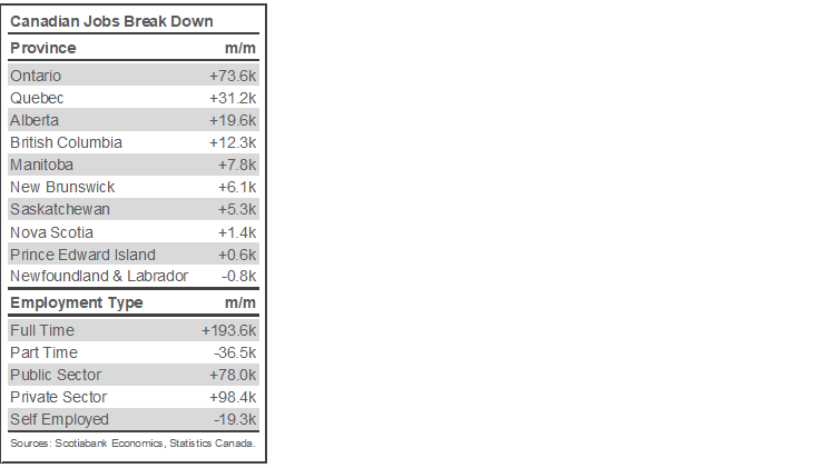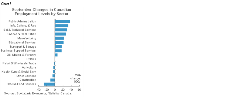The election contributed to the 37k rise in public administration jobs as election enumerators and poll clerks temporarily added jobs. StatCan notes that this category was up 13k in September as advance voting opened into the LFS reference week that includes the 15th day of each month. Even excluding this transitory driver would have still yielded an above consensus pace of job gains.