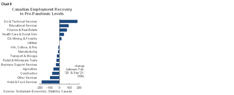 The cumulative recovery to date shows services employment is up a net 129k and it’s the goods sector that is still down a net 128k jobs. Chart 6 shows what subsectors in goods and services are up or down in net terms so far during the pandemic. Note, however, that it’s the public sector jobs that are up in net terms during the pandemic (+257k) as private sector payroll jobs are still down 16k with self-employed (a mixture of public and private) still down 16k.