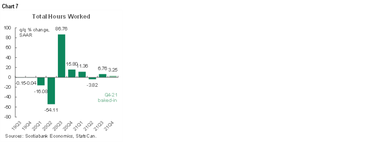Canadian hours worked were up 6.8% q/q SAAR in Q3 after the 3.8% drop in Q2 (chart 7). 3.2% growth in hours worked is 'baked in' for Q4 given the way the math evolved, meaning even without any further gain in Q4 we'd have a strong lift.