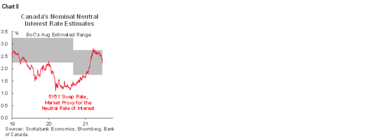 Which concludes with our forecast. If the BoC sticks to script and only hikes once the output gap is shut, then note that this isn’t likely to happen until next summer and possibly later. We still have July pencilled in for a first hike which is less aggressive than markets, but where we remain more aggressive than markets is toward the path thereafter. BAX futures end 2023 about five hikes higher from here versus our seven. Our forecast assumes the BoC hits 2% by the end of 2023 and hence into the bottom end of the BoC’s neutral rate range of 1.75–2.75%. That’s higher than market pricing that far out, but lower than market proxies for where the BoC’s neutral rate may be (chart 8). In all, we may be at risk of being light on starting rate hikes, but are still heavier on the cumulative path for rate hikes that position the Canadian front-end through the belly to be looking rather dear.
