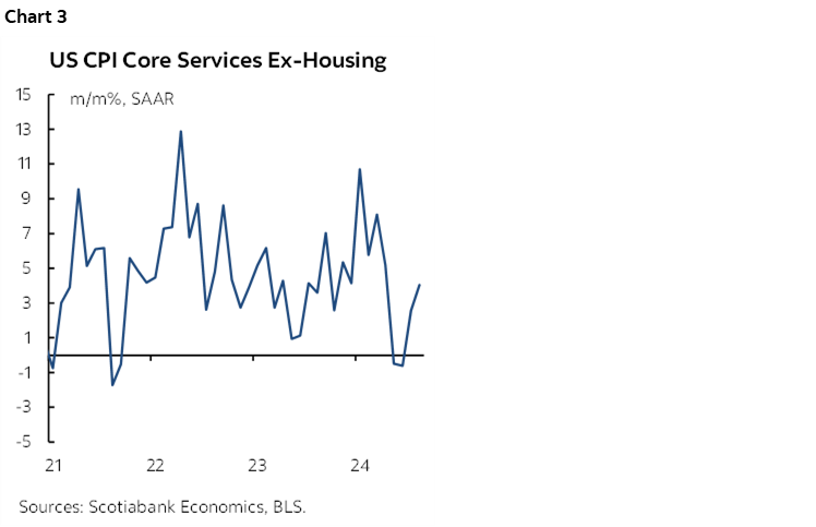 The culprit was a mild acceleration of core services prices. CPI services ex-housing and energy services was up by 0.33% m/m SA which is the firmest reading since April (chart 3). Services ex-energy services were up 0.4%.