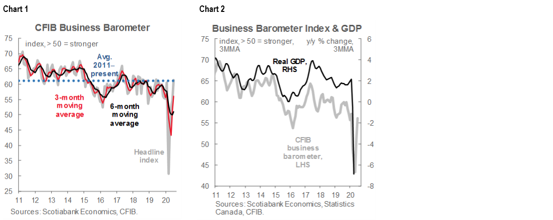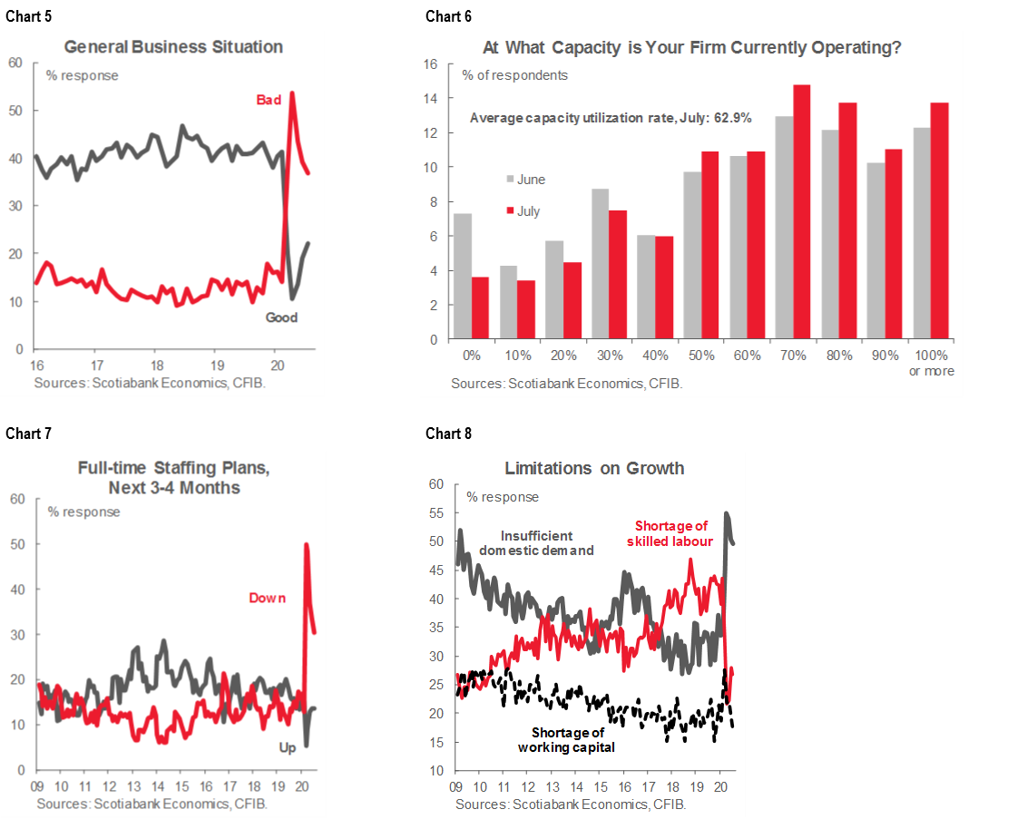 The Canadian Federation of Independent Business’ (CFIB) monthly Business Barometer Index increased to 61.3 in July, more in line with its historical average (chart 1). SME sentiment is normally a leading indicator of economic activity, supporting what looks to be a bounce back in Q3 (chart 2) barring any setbacks in the coming months. As governments begin to lift more restrictions, the durability of the recovery will depend on how successful the general population remains at keeping the virus at bay.