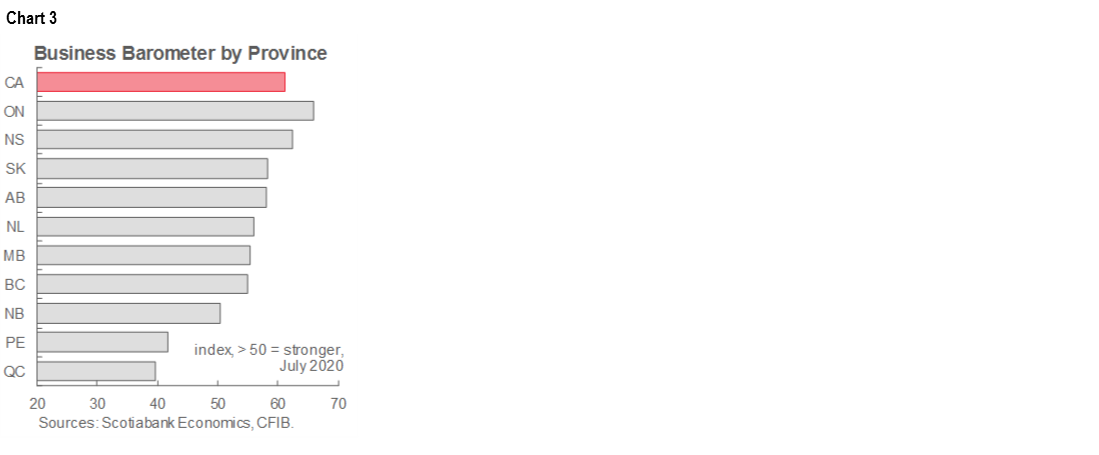 Provincial business sentiment continues to improve, with 8 out of 10 provinces now above the 50 point threshold (chart 3). Ontario posted the strongest gain in July, increasing 12.0 points to 66.0. Quebec SME sentiment increased slightly to 39.6 but remains the most pessimistic province.