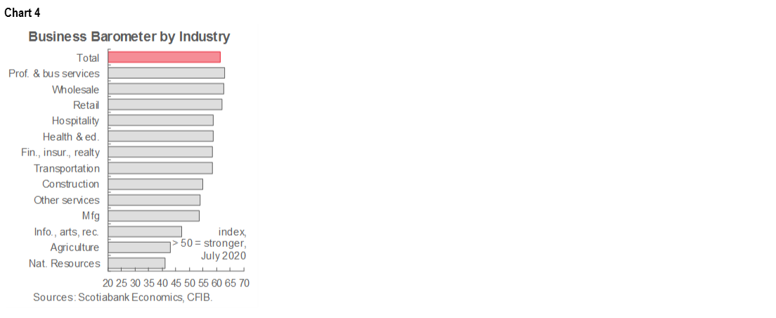 Similar to the provinces, sentiment by industry continues to improve with 10 out of 13 industries also breaking the 50 point threshold (chart 4). Professional and business services was the most optimistic industry in July but, not surprisingly, retail sales had the largest single month gain, increasing 11.3 points to 62.0 as restrictions were increasingly eased across jurisdictions. Also not surprisingly, sentiment remained weak in agriculture and natural resources, two of the harder hits industries during the pandemic.
