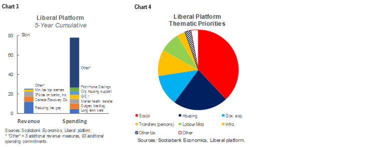 The Liberal Party offered a little bit of something for everyone in its platform. It laid out 100 different spending proposals at a gross cost of $78 bn over five years—or $108 bn once already-pledged funding for $10/day childcare is included. Childcare aside, there was no signature measure under the campaign platform with two-thirds of spending spread across almost 20 initiatives (chart 3). However, clear themes emerged with almost 40% of spending pledges (or $29 bn) targeting social supports, delivered mostly through conditional transfers to provinces related to healthcare, mental health, and long term care. Housing measures captured another 20% of the platform commitments (or $17 bn), followed by government expenditures (at 12% or $9.5 bn) spread across an expansive set of priorities, and targeted household transfers (11% or $8 bn), notably increases to the Guaranteed Income Supplement for seniors as well as student loan provisions (chart 4).