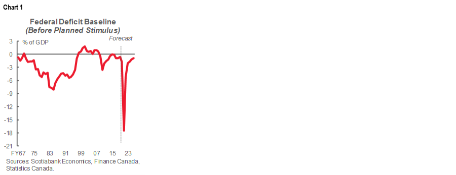 The federal government has set out a “baseline” for the deficit path absent further stimulus. It profiles shortfalls of $121 bn (-5.2% of GDP), and $50 bn (-2.1% of GDP) in FY22 and FY23, respectively, and sees deficits continuing to decline over time to less than 1% of GDP by FY26. This baseline incorporates about $15 bn over five years in new outer-year commitments under the guise of ‘building back better’. Pledges are diverse: $2.6 bn (over five years) for home retrofits, $2.5 bn for reconciliation, $2.3 bn for a one-time Canada Child Benefit top-up in 2021, $1.3 bn for tree-planting, and the numbers get smaller and smaller.