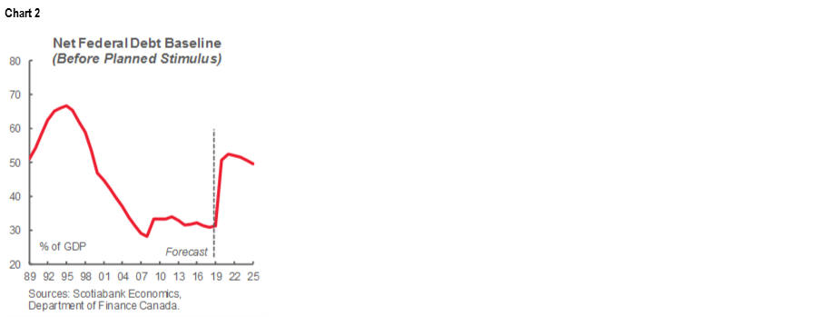 The blow to government revenues contributes to a quarter of the shortfall, while COVID-19 spending will add another $275 bn of deficit financing this year. The bulk of increases in pandemic spending had already been announced—but not costed—prior to the update, whereas new announcements reflect about $25 bn. This includes a $17 bn top-up to the wage subsidy program to bring its coverage back up to 75% for the remainder of the fiscal year.