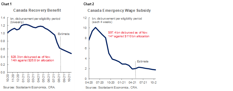 These steps likely have minimal impact on the fiscal balance. The programs were slated to expire and had largely exhausted their balances so the wind-down does not provide savings to the bottom line (charts 1 & 2). But it does remove an important upside risk of permanency around pandemic spending, something that rating agencies, in particular, have been monitoring carefully. The NDP leader has indicated he would not support the rollback of these measures, but it would likely receive support from the right.