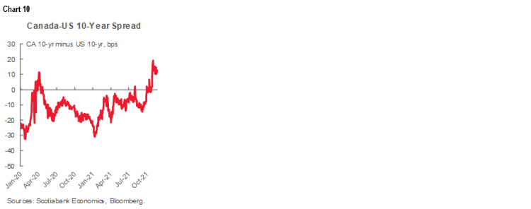 Canada’s divergence relative to US yields has mostly been policy-driven with a lot of volatility around the news cycle. Markets had been pricing in an earlier and more aggressive path of rate hikes by Canada—a position reinforced by the Bank of Canada’s October 27th communications—but developments south of the border since then have narrowed that assessment (chart 10). A more expansive fiscal stance in Canada relative to the US could see that differential open up again, but it would be premature to assume much more spending for Canada, while it could also be premature to write-off additional stimulus in the US just yet.