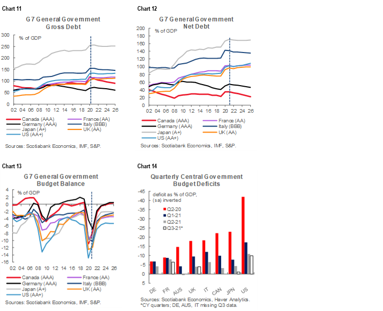 For now, Canada’s fiscal fundamentals still look relatively attractive. As discussed more in depth in our preview, all sovereigns have seen a step change in debt levels. Canada’s general government debt in net and gross terms is unremarkable (again in relative terms), while its debt still offers yield pick-up (charts 11 & 12). Meanwhile, its general government deficit is consolidating at a faster clip than most comparators: the IMF projected Canada should approach balance by 2023—and possibly earlier once recent provincial updates are incorporated (chart 13). Even at the federal level, Canada’s spending is falling back more rapidly than peers; albeit reserve currency status provides more cover for the likes of the US and Japan with the latter about to unleash a new round of stimulus (chart 14).