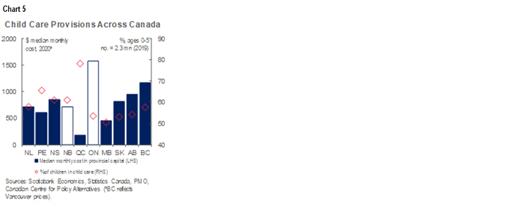 This is an impressive feat, but only gets governments to the starting line. Child care costs and funding supports are highly variable across the country from a median monthly cost of $1,578 in Toronto to $181 in Quebec City (chart 5). Negotiated agreements so far across provinces work out to roughly $210 in monthly subsidization per child (ages 0–5). Current provincial (and municipal) spending on childcare is highly opaque, but Quebec reportedly spends $2.7 bn annually on its $8.35 a day child care program, working out very approximately to $550 per month per space. Clearly, more heavy lifting will be required by other provinces where gaps are bigger, even with a federal agreement in place. On the other hand, households with children in these provinces stand to gain more from an affordability boost as early as next year if interim targets are achieved—but this is not going to materially impact inflationary prints any time soon.