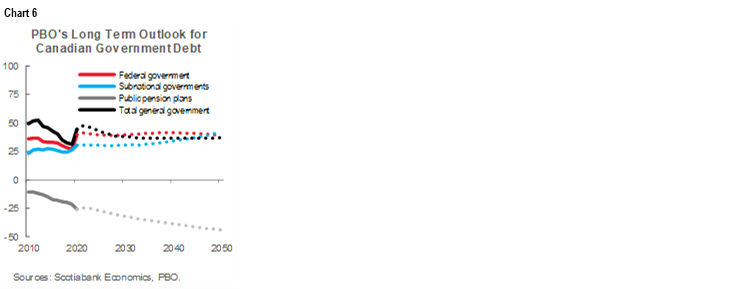Provinces may be left wanting with this Speech, but this was largely expected. Health care spending is expected to reach $308 bn in 2021 according to the Canadian Institute for Health Information, with provinces shouldering the bulk of these costs. The Parliamentary Budget Officer stresses each year that while Canada’s general government fiscal trajectory is sustainable, the outlook across levels of government tells a different story (chart 6). Premiers have been largely united over the past two years in their call for a permanent increase in the federal share of health costs to 35%, translating into a $28 bn annual increase (and rising) to the Canada Health Transfer which is currently pegged to nominal GDP growth.