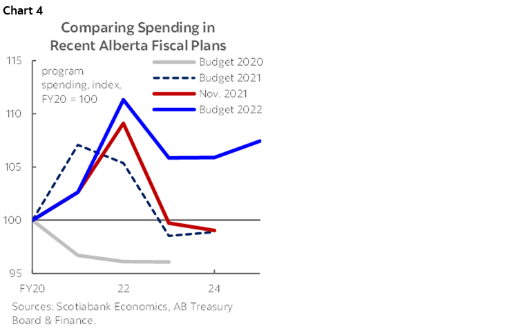 Projected FY22–24 budget balance improvements of $9.6 bn versus the mid-year fiscal update are roughly evenly split across the three years, and stem primarily from natural resources. Own-source revenue projections were increased by $15 bn during FY22–24—with $9.4 bn sourced from non-renewable resource revenues. Meanwhile, federal transfer forecasts were lifted by $3.2 bn over the three years, with support from a one-time Fiscal Stabilization payment in FY23 and funds for the Child Care Agreement with Ottawa. Program spending projections were raised by $8 bn over FY22–24 (0.7% of forecast GDP), Rather than November 2021 plans for program expenditure cuts of 9% (FY23) and 1% (FY24), outlays are set to fall by just 5% in FY23 and sit $3.8 bn (7%) higher in FY24 than forecast in the mid-year plan as well as 6% higher than FY20 levels in FY24 (chart 4, p.2).