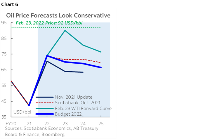 Fiscal plan projections also contain significant upside. WTI price projections—completed before the Russia-Ukraine geopolitical conflict surfaced and bid up crude prices—are about 2 USD/bbl below our January forecast for FY23 and more than 20 USD/bbl lower than the level at which crude closed on Feb. 23, 2022 (chart 6). With the estimated Budget net fiscal impact of $500 mn per 1 USD/bbl, this suggests bottom line improvements of at least $1 bn in the coming fiscal year. Budget also includes contingency and disaster assistance amounts of $1 bn in FY23 and $750 mn in both FY24 and FY25. Finally, potential increases to the Canada Health Transfer—per demands from the provincial and territorial premiers—could further boost Alberta coffers (as well as those of other regional governments). The government stated that it will consider dedicating surplus revenue to the Heritage Savings Trust Fund—an income-generating fund that helps finance key programs—or debt repayment.
