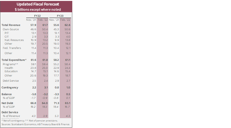 As widely anticipated, Budget 2022 contains a lot of good fiscal news. Alberta now expects surpluses for FY23–25 instead of deficits through at least FY24 and—quite remarkably—is on track to balance the books for the first time since FY15 and just two years after a record $17 bn shortfall in FY21. A $9.6 bn total bottom line improvement for FY22–24 builds on the $26 bn gain announced just three months ago in the FY22 mid-year fiscal update. As a share of output, net debt forecasts remain on a downward trajectory, with a terminal rate less than 15% in FY25—the lowest among the provinces that have announced plans so far. Total debt servicing costs of about 4% of total revenues throughout the forecast horizon are both manageable and low relative to history, even after accounting for interest rate increases expected over the next two years.