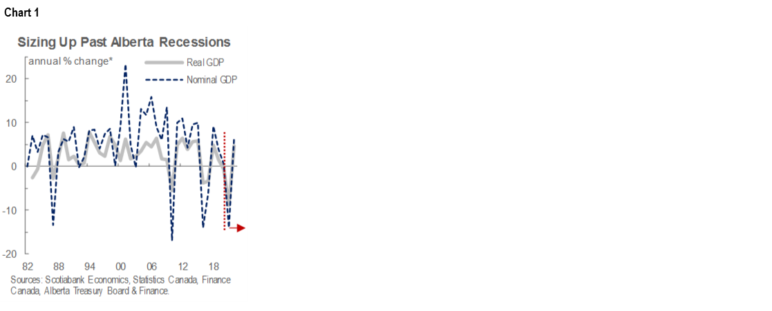 As widely anticipated, 2020 is set to be an historically challenging year for Alberta’s economy. As elsewhere in the world, a near-complete shutdown of the provincial economy to contain the spread of COVID-19 is expected to contribute to historic annual drops in employment (-7%), corporate profits (-73%), and real exports (-13%). Forecasts for WTI and WCS crude prices—under pressure since the virus crippled fuel demand—were both revised roughly $20/bbl lower than anticipated at budget time, in line with our own projections. All told, real GDP is expected to plunge by 8.8% in 2020—the worst annual decline since at least 1982. Nominal GDP is poised to drop 13.9%, the third-steepest ever-recorded drop (chart 1).