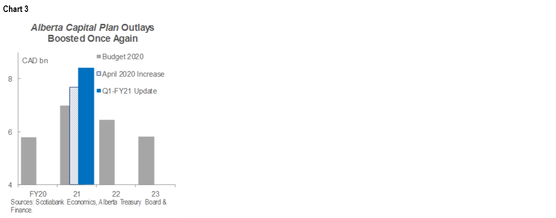 In respect of the severe ongoing economic challenges, Capital Plan expenditures are now expected to total $8.4 bn in FY21. Since scaling back infrastructure outlays in its maiden fiscal plan in 2019, the government has laid out a series of spending increases (chart 3, p.2). The two most recent boosts reflect the severity of COVID-19 downturn, with the largest funding increases since February allocated to the Departments of Municipal Affairs and Housing, and Transportation, reflecting economic stimulus efforts. With the previously announced $1.5 bn investment to accelerate work on the Keystone XL pipeline, the Province has allotted nearly $10 bn to infrastructure in FY21.