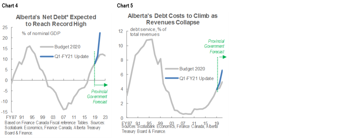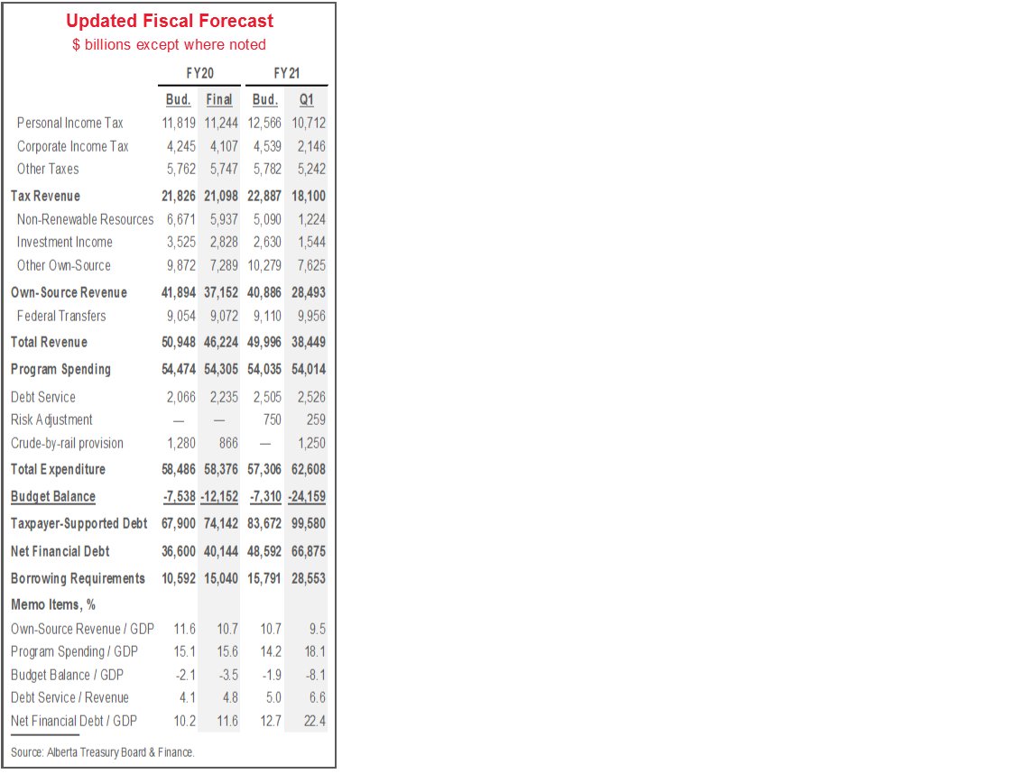 Alberta’s first official update since COVID-19 reached Canadian shores projected a record deficit of more than $24 bn (8.1% of nominal GDP) and a record 22% net debt-to GDP ratio for fiscal year 2020–21 (FY21).