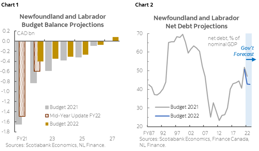Newfoundland and Labrador’s latest budget features some near-term improvements, keeping deficits and debt burden at bay through FY23. In outer years, the plan maintained the target of returning to surpluses in FY27, pencilling in narrowing deficits of under 0.8% of GDP from FY24 to FY26—largely the same as in the last budget. While the updated fiscal trajectory reversed the aggressive spending cut that underpinned the last budget, expenses will be kept flat throughout the forecast horizon.