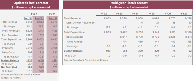 Major project timelines could be consequential to the outlook. The Muskrat Falls project—the completion of which was likely delayed for another year—secured a $5.2 bn federal funding package. The package includes $2 bn in federal financing, $3.2 bn in Hibernia revenues, and $2 bn from the conversion of GNL equity to preferred shares. This aims at staving off massive electricity rate hikes. We discussed the impact of the project on the province’s finances here. The Bay du Nord project—approved on the same day as the budget release—could provide more upside in capital investments and employment opportunities. With details of the timeline still in the making, this offshore oil project is anticipated to go into production as early as 2028.