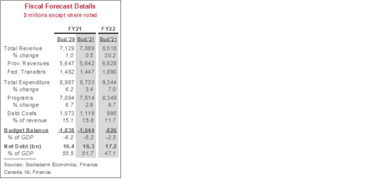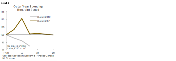 A hefty projected economic rebound this year is partly behind the expected near-term improvement in NL’s finances. The 5.6% real GDP gain penciled in for calendar year 2021 compares with a 3.8% private-sector average, and would be the strongest advance witnessed in the province since 2007, when crude output peaked. The forecast reflects expectations of a strong reopening effect as vaccine rollout continues, robust iron ore production, and the spillover impacts of strengthening crude and mineral prices. Accordingly, total revenues are forecast to rise by over 20% in FY22, with about one-third of the gain sourced from offshore royalties. That expansion is expected to come despite suspended activity at the Terra Nova oil field and West White Rose project in 2021.