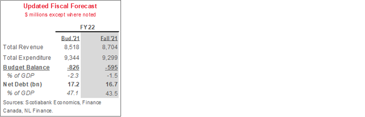 This Update lays out reductions in Newfoundland and Labrador’s projected budget balances and net debt levels, which are incrementally positive from a fiscal sustainability perspective. A stronger-than-previously anticipated economic recovery—particularly in nominal GDP—leaves the province with stronger revenues and puts it slightly ahead of prior consolidation plans. For the moment, that also puts NL’s net debt burden roughly in line with that of Ontario as a share of GDP in FY22.