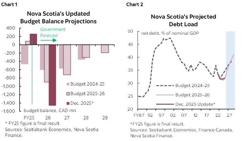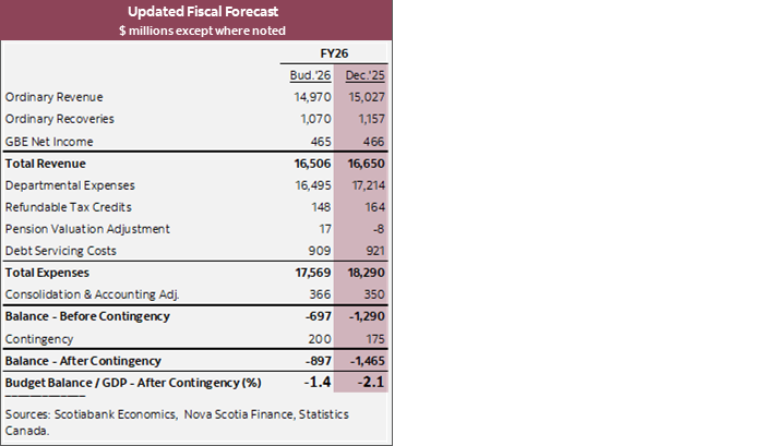 - Nova Scotia’s December 2025 forecast update revised the budget balance for fiscal year 2025–26 (FY26) to -$1.47 bn (-2.1% of nominal GDP) after accounting for contingencies (chart 1). The latest outlook sees a larger deficit for the current fiscal year, rising from -$0.9 bn (-1.4%) expected in Budget 2025–26, as higher departmental expenses outweigh higher revenue. The update also reports a $25 mn draw down from the $200 mn contingency funding set aside at the beginning of the fiscal year, with $175 mn in contingency remaining.